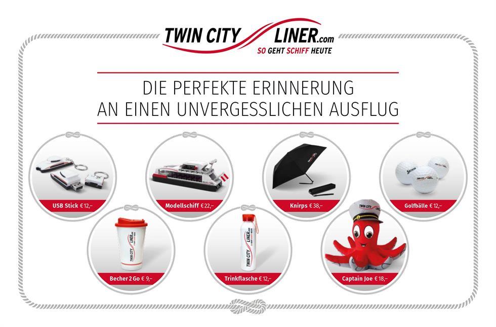 "USB-Stick Twin City Liner", 12 EuroPerhaps save the most beautiful souvenir photos of an unforgettable trip on the Danube on it. 16 GB USB stick in Mini Twin City Liner shape as a practical key ring."Twin City Liner Mug 2 Go", 9 EuroWhether in the office or at home, the coffee tastes best in our Twin City Liner mug."Twin City Liner Bottle", 12 EuroWhether you're doing sports or travelling, you'll always be ideally supplied with our lightweight and robust water bottle in Twin City Liner design.